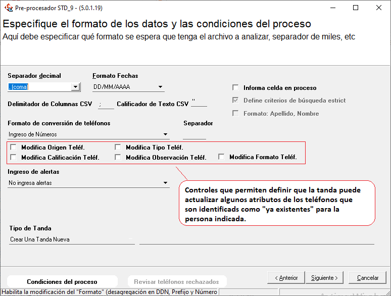 En el preproceso de un archivo se define también lo que luego hará AltasLT al procesar la tanda de datos. Los controles identificados como “Modifica Origen”, “Modifica Tipo”, “Modifica Calificación”, “Modifica Observación” y “Modifica Formato” permiten definir cuales atributos de cada teléfono pueden ser modificados o corregidos por la tanda de nuevos datos.
