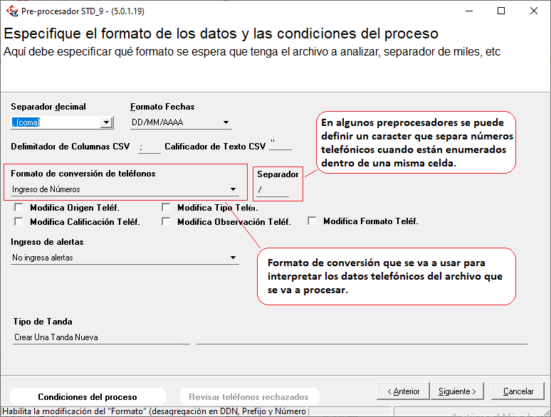 Ahora se puede definir el formato de conversión de teléfonos que se va a aplicar sobre todos los teléfonos del archivo a ingresar.