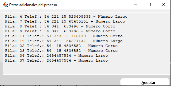 El resumen del proceso informa las cantidades de números de teléfono detectados, ingresados y rechazados.